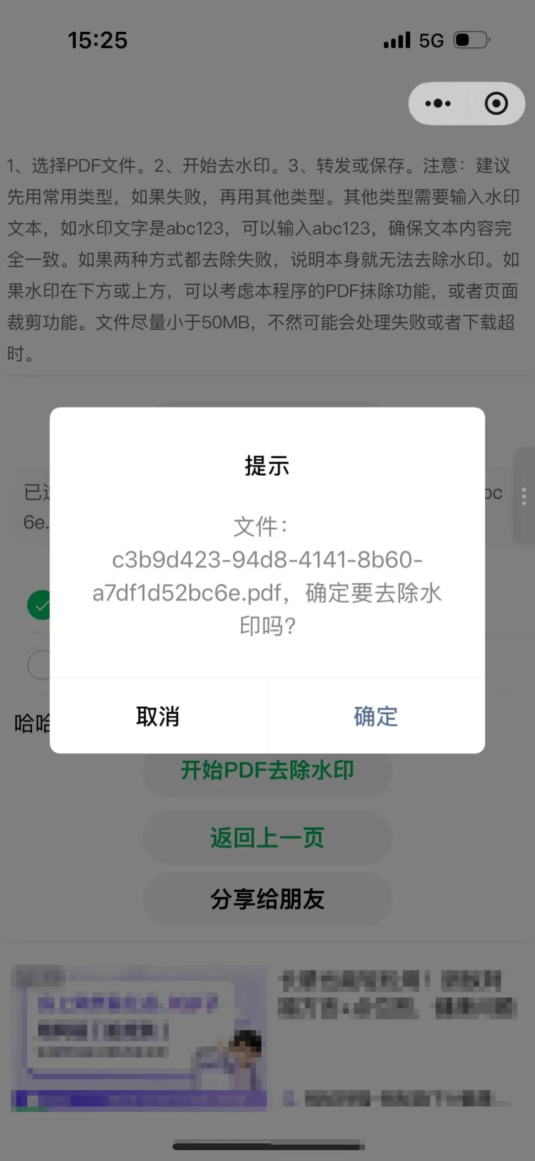 如果两种水印都去除失败的话,大概率这个水印是无法去除的。一般正常来说,对于WPS的试用水印以及全能扫描王的水印非常有效果。同时,如果有些水印在边缘的,可以尝试下本程序的裁剪的功能或者抹除的功能,都是比较合适的。最后,文件大小尽量小于50MB,不然可能会处理失败或者下载超时哦。