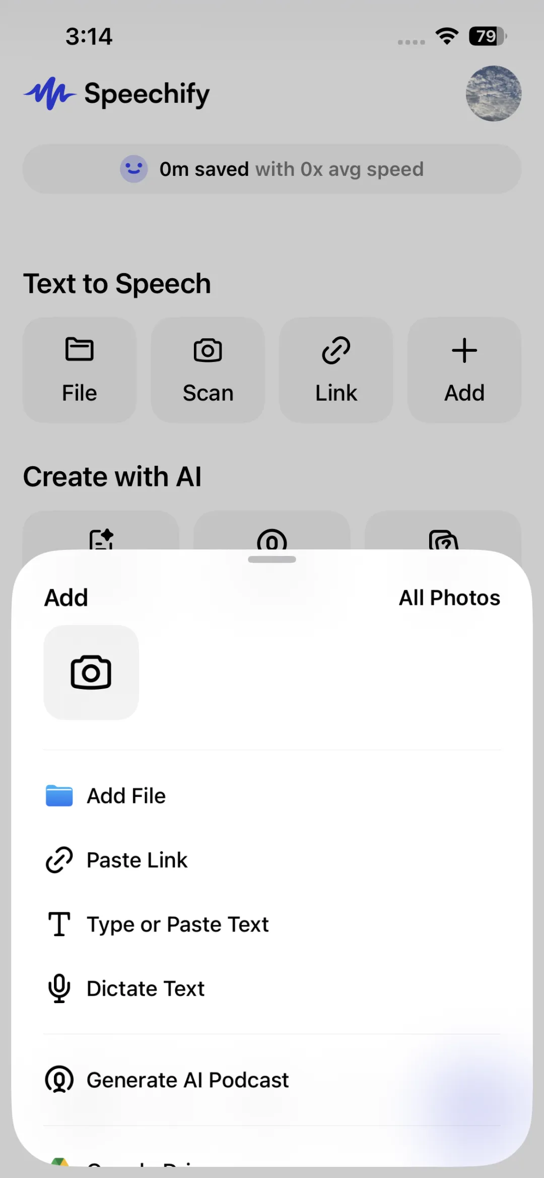 但 Speechify 的 AI 音色真的惊艳到我了!它不仅支持上传 PDF、Word,连扫描图片里的文字都能读。