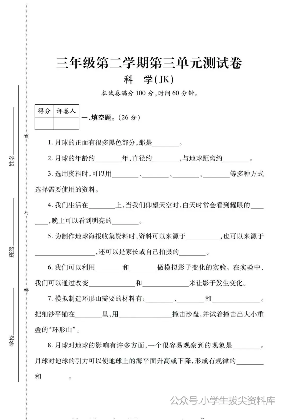 三年级科学第三单元测试卷(JK版)——让孩子在探索中发现太阳和月球的奥秘!