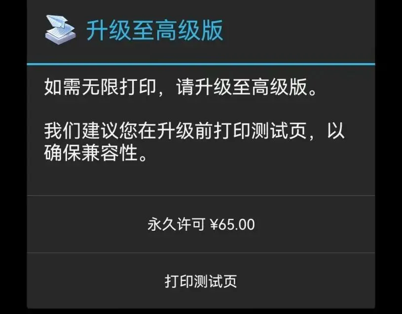 这个可以支持远程打印,也可以支持直接从微信打印,基本上能做到随时随地都可以打印。只是可惜,要实现这些需要花钱购买高级版的软件。手机客户端有直接升级至高级版的连接,需要支付65元。