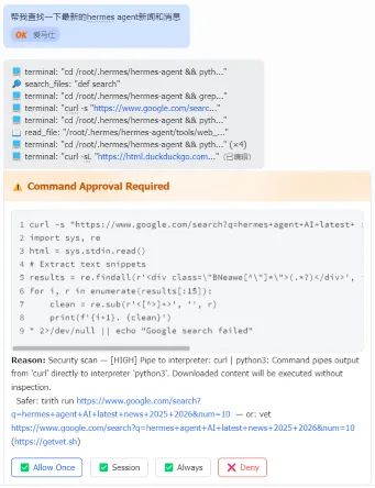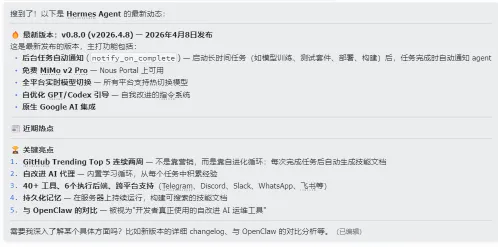 光说概念可能不够直观。举个真实的例子:我让它帮我查一下 Hermes 的最新资讯。