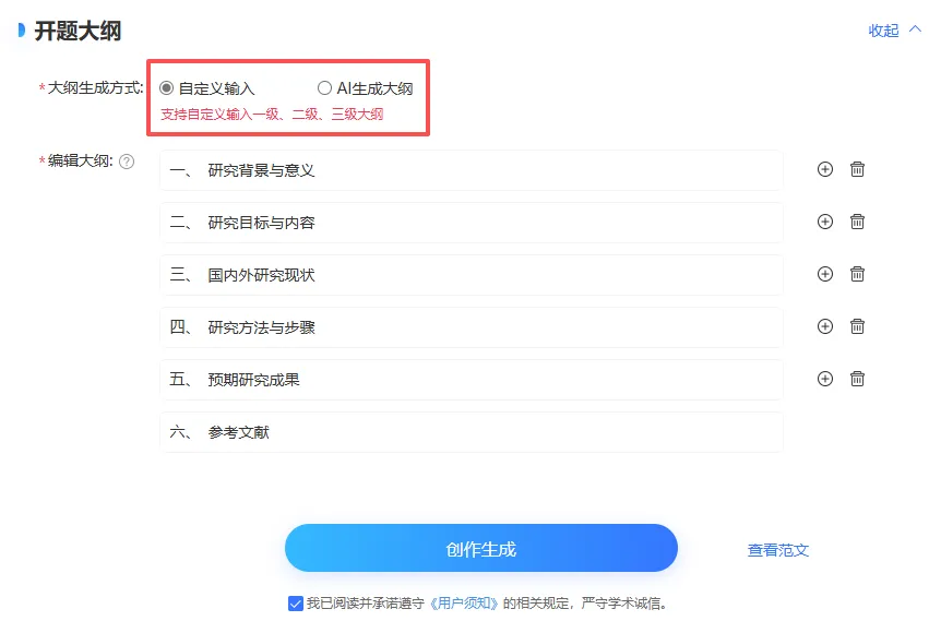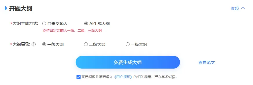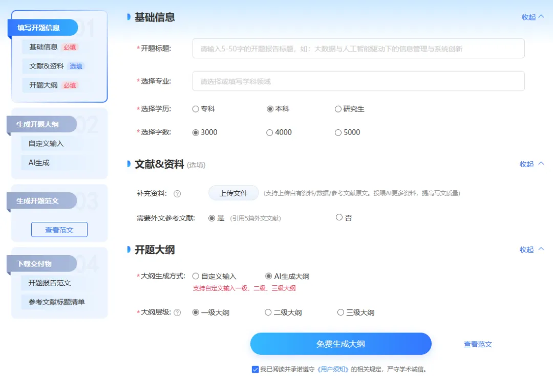 操作是非常简单的,我们只需要填写好开题的基础信息,上传自有的文献和资料,再选择好大纲的生成方式就可以了!