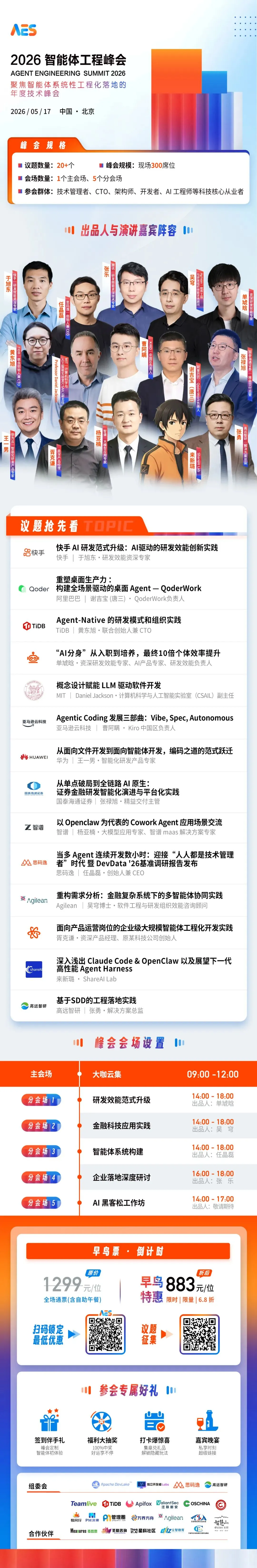 我们诚邀您亲临2026 智能体工程峰会(Agent Engineering Summit 2026)现场,与技术专家,技术管理者、一线 AI 实践者共同探讨AI时代研发体系的进化之路。
