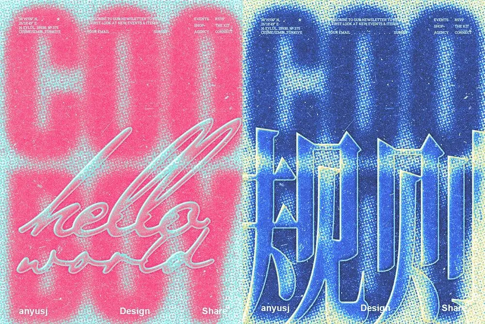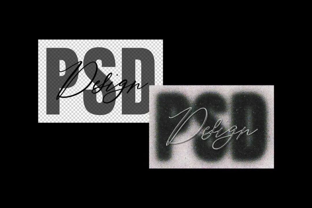 复古半调波点+透明玻璃文本logo叠加特效PSD样机