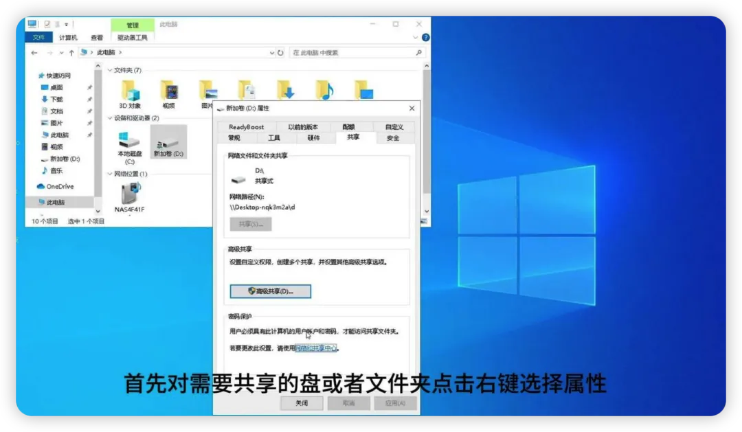 右键文件夹→「属性」→「共享」→「高级共享」,勾选「共享此文件夹」,自定义共享名(如 ShareDocs)