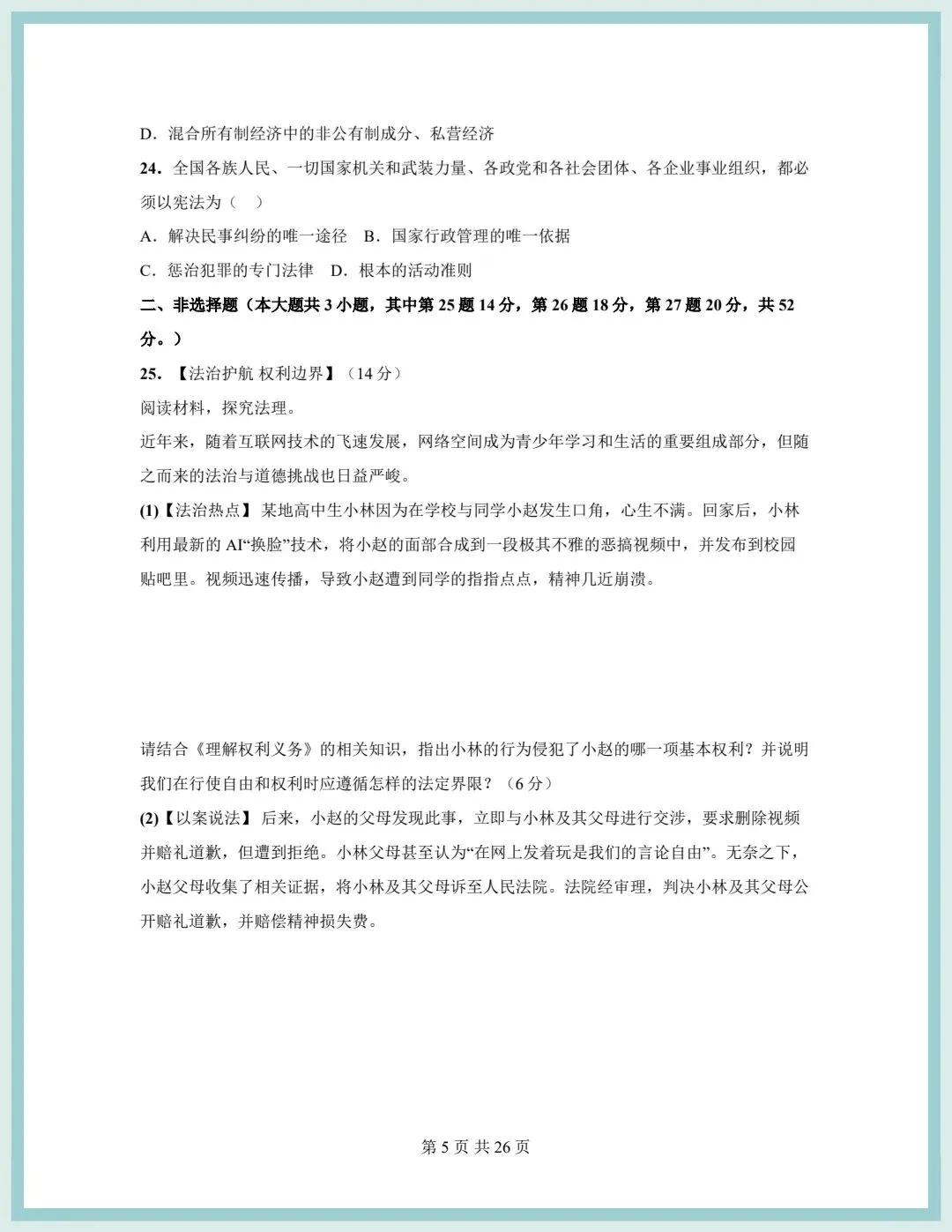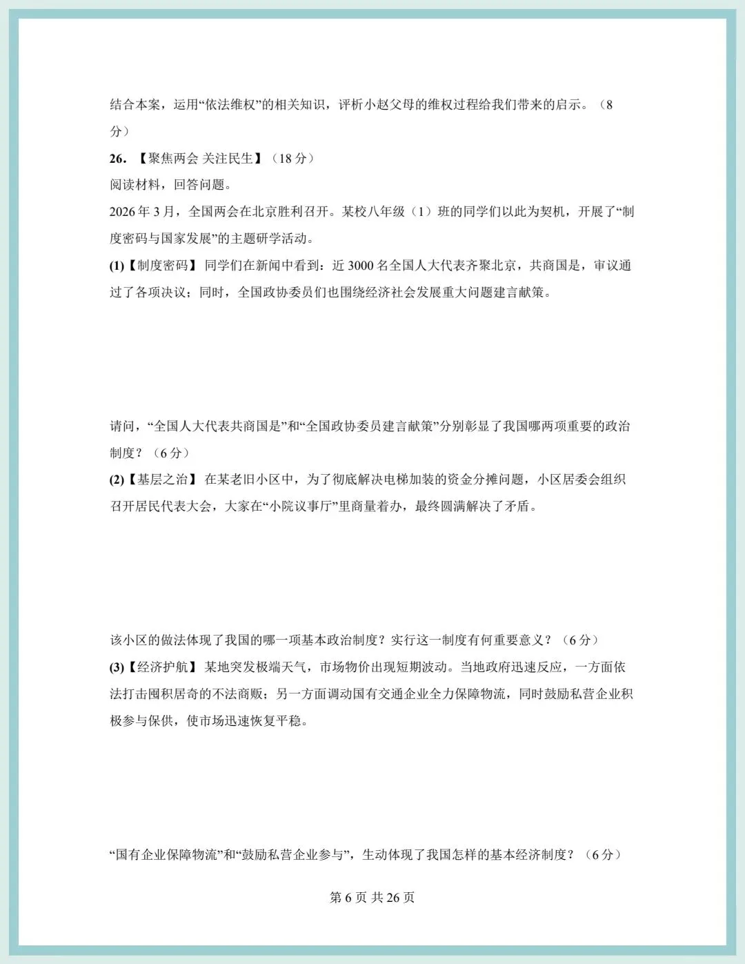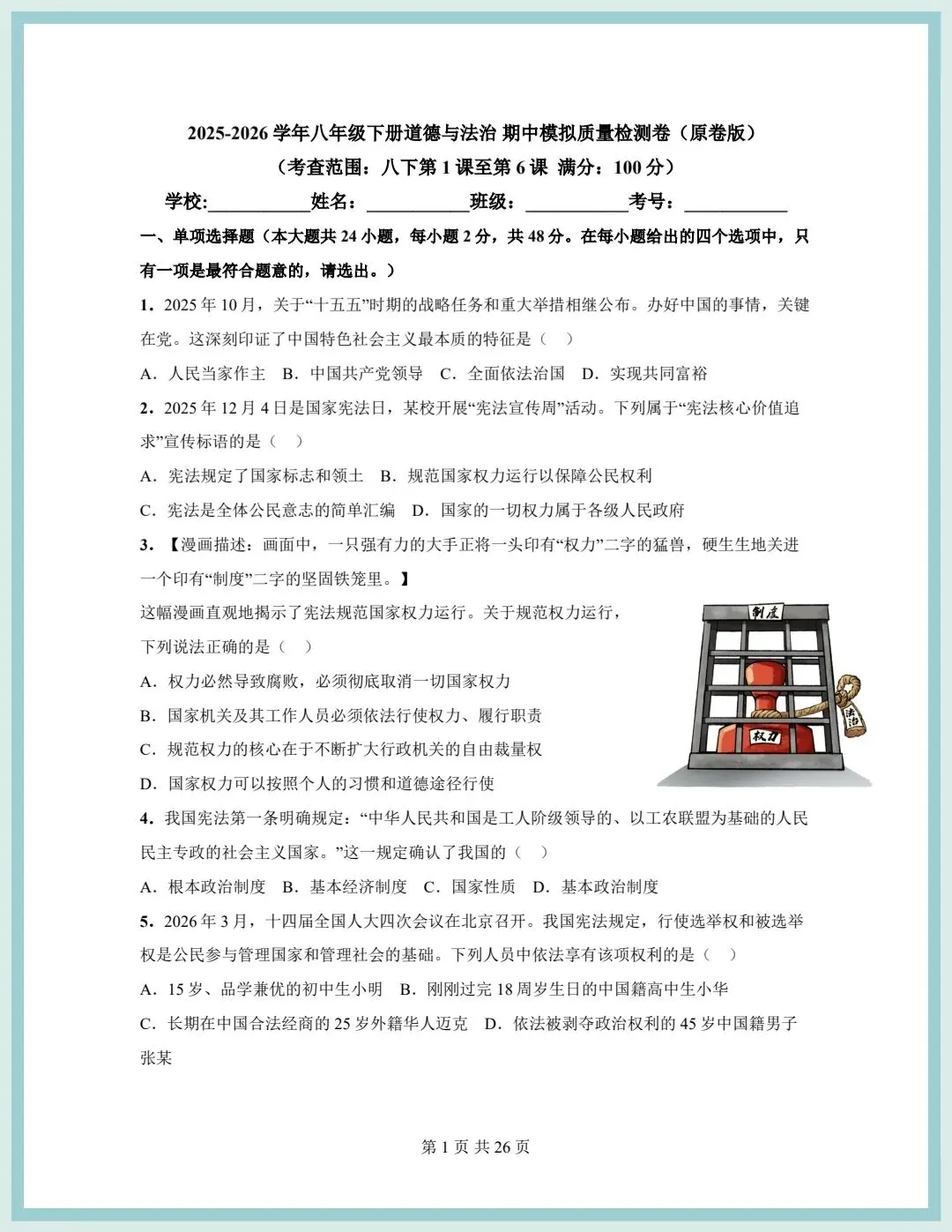 2026春统编版八年级下册道德与法治期中模拟质量检测卷(含答案),可打印!
