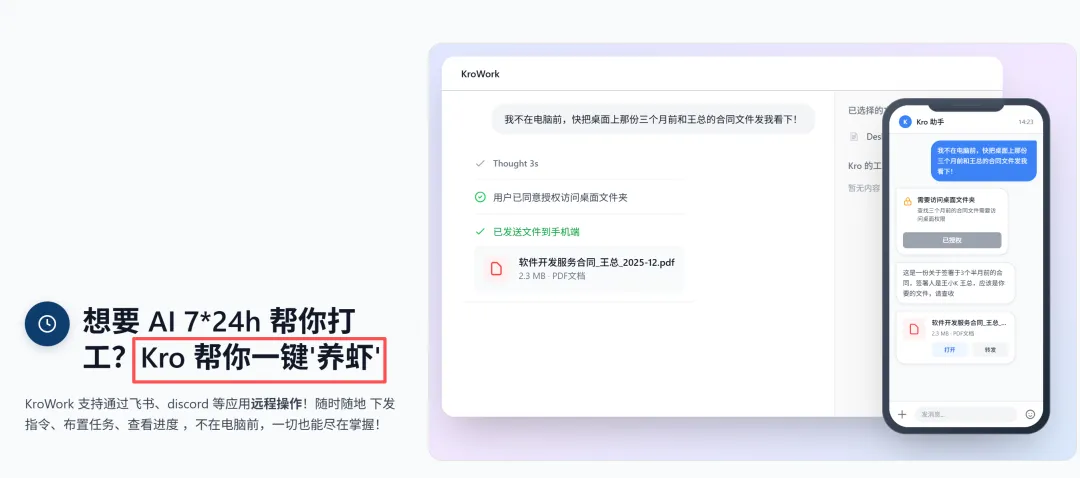值得关注的是,KroWork支持一键“养虾”,且支持通过飞书、discord 等应用远程操作,用户无论是否在电脑前,均可通过这些渠道向工具下发指令、布置任务,实时查看任务执行进度,实现“7*24小时不间断工作”,进一步突破时间与空间的限制,提升工作灵活性。