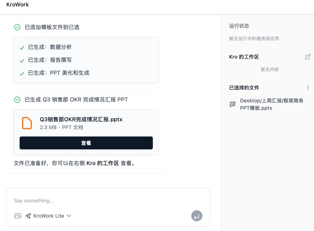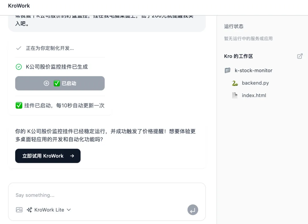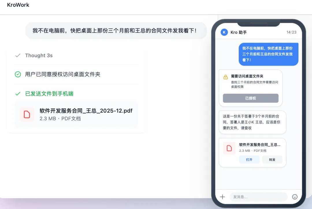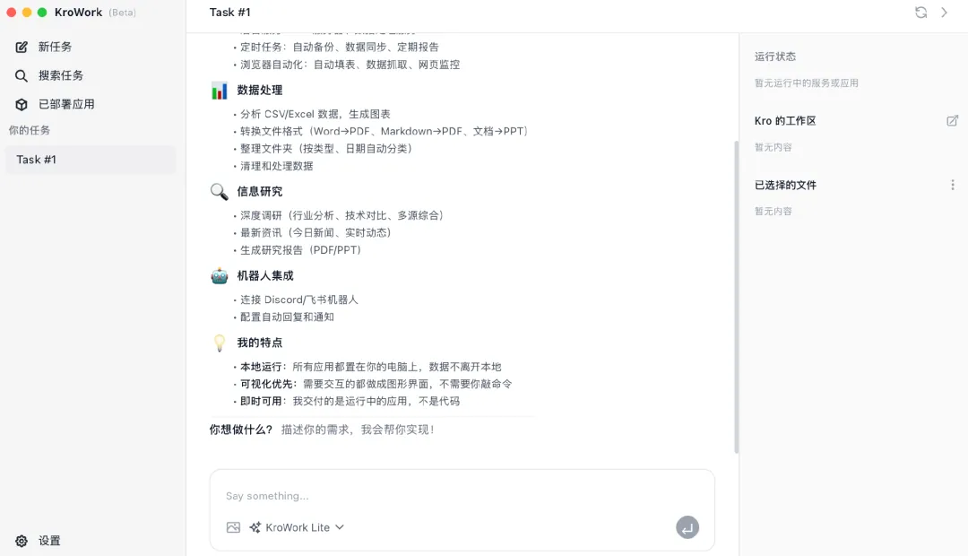 值得注意的是,KroWork还具备远程协同能力,支持通过飞书、Discord等主流协同应用实现远程操作。用户无论是否在电脑前,均可通过这些渠道向工具下发指令、布置任务,实时查看任务执行进度,实现“7*24小时不间断工作”,进一步突破时间与空间的限制,提升工作灵活性。