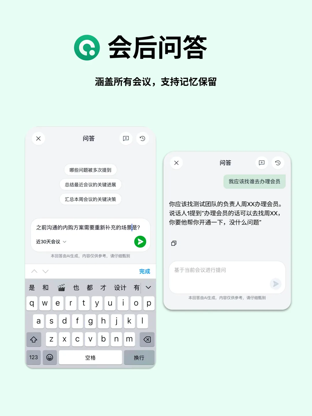 核心优势1:跨会议调取记忆,不止当前会议最实用、最贴合产品经理需求的一点是:Qingzhou可调取你之前所有会议的内容记忆,无论哪一场会议、过去多久,你都能随时向它询问相关任何细节,它都会精准调取记录、给出答案,不用再翻找繁杂的纪要、堆积的文档,彻底摆脱「回头查、反复理」的内耗。