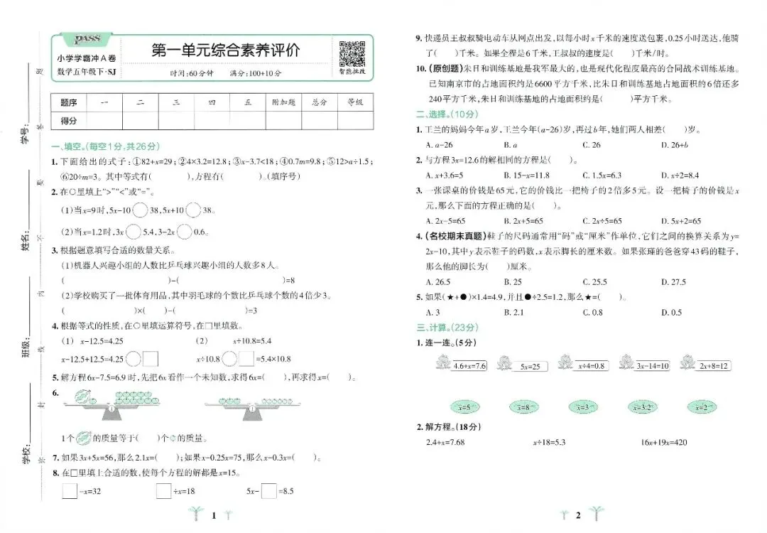 苏教版数学五年级下册《小学学霸冲A卷》(可下载)