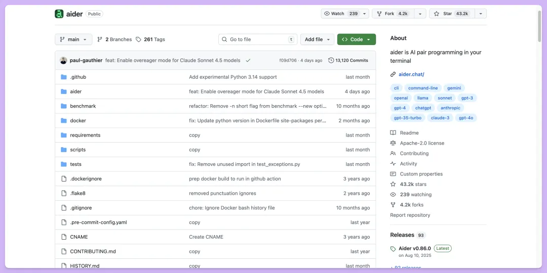Aider 是开源 CLI AI 编程工具里历史最久、社区最活跃的一款,经过大量真实项目的打磨,可靠性很高。