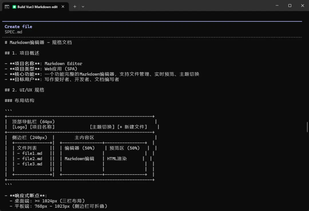 Claude Code会先生成一份详细的规格文档,包括: