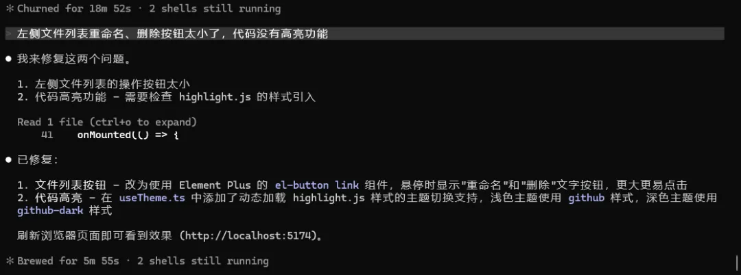 发现一些需要优化的地方,左侧文件列表重命名、删除按钮太小了,代码没有高亮功能,让Claude Code再修改下。