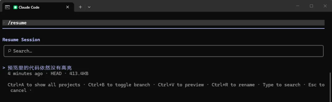 通过/resume可以恢复之前的会话,通常在新开启会话时使用,也可以使用claude -c直接开启会话。