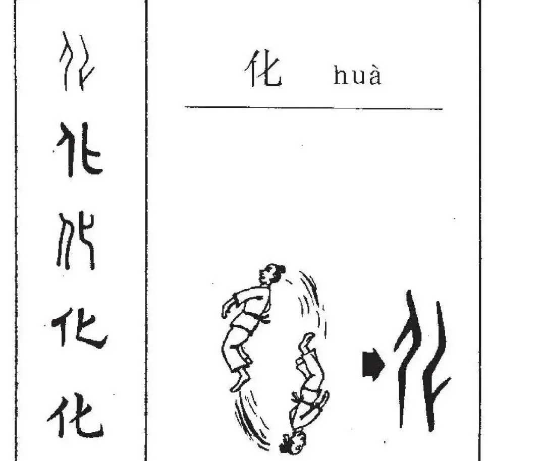 我们再看文化的化字。甲骨文是怎么写的。是两个人,一个是站立的,另一个是头朝下颠倒的。表示的就是以文德去教化野蛮。就是化的意思。
