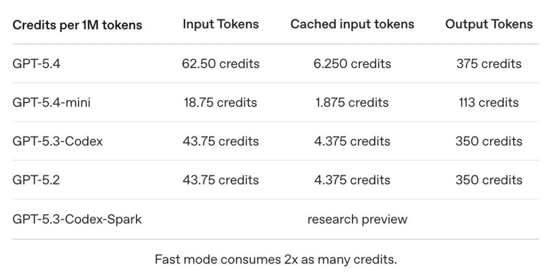 输出比输入贵得多 —— GPT-5.4 输出 1M Token 要 375 Credits,而输入只要 62.5。这意味着让 AI 写长文档比问短问题更”烧钱”。