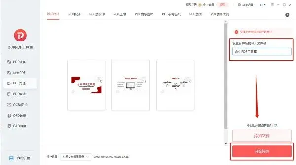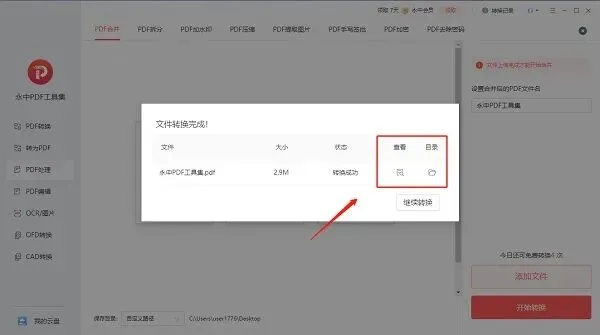 永中 Office 可直接保存输出 PDF,也能通过永中 PDF 工具集在线上传 Word 文件,一键完成转换并查看结果。 永中 PDF 工具集客户端支持免费合并 PDF,添加文件后自定义名称并开始转换,完成即可查看,还能继续批量处理。