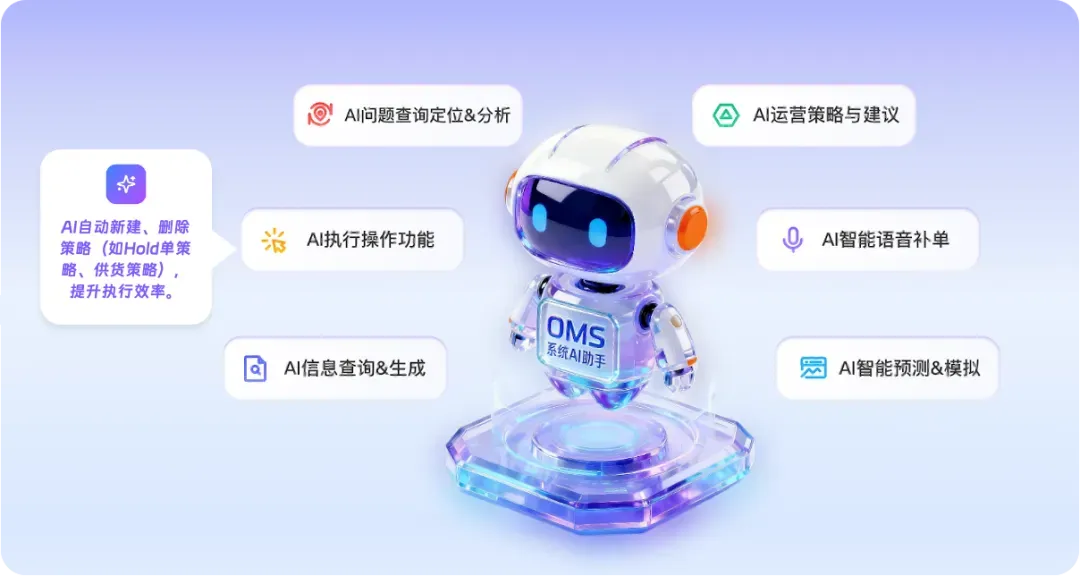 简单说:无论消费者在哪个渠道下单,OMS都能自动、准确、高效地完成从接单到发货的全过程,并能灵活应对各种复杂业务场景。系统AI助手作为核心引擎,持续学习业务数据,为智能调度、风险预警和决策优化提供支持。