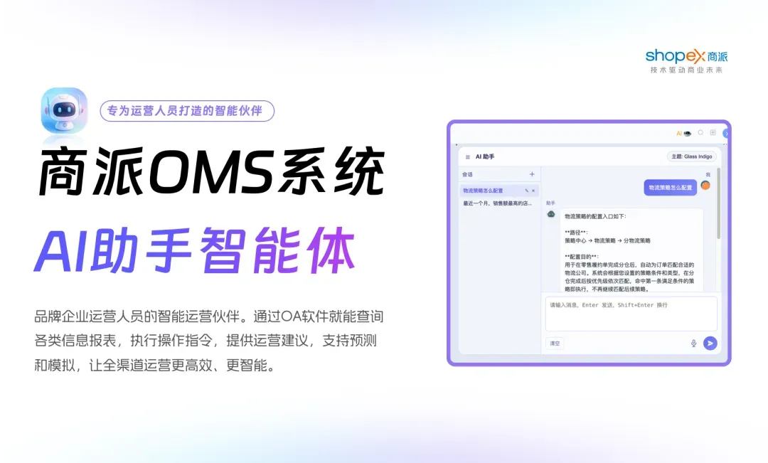 全渠道融合的时代。商派OMS订单管理系统(又称业务中台)正是为品牌企业量身打造的全渠道零售业务管理的智能中枢。它不仅是订单/商品/库存处理工具,更是连接前端销售、后端仓储与物流的“智慧大脑”,帮助品牌企业实现从“人找货”到“货找人”的运营升级。内置自研的商派OMS系统AI助手,更是将智能决策与自动化运营操作能力融入每一个环节,让系统从“高效执行”迈向“智慧决策”、“前瞻预测”。