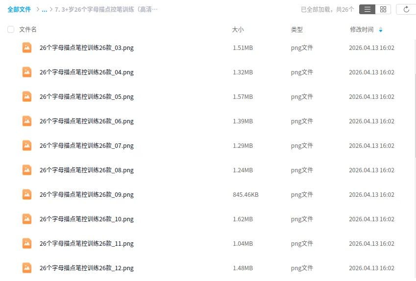 【免费资源】26个字母控笔描红,高清可打印,3岁+宝宝在家就能练! 本/期/资/源/ 今天给大家准备了一套超实用的 《26个字母描点控笔训练》 ,专为3岁+宝宝设计,高清可打印,在家就能做幼小衔接! 领取方式 免费领取: 第一步:分享文章至朋友圈,点一点右下角的点赞和推荐 第二步:关注公号后,对话窗发送20260413领取 特别声明 本微信公众号分享的资源均通过网络等公共合法渠道获得,版权属于出版机构或原作者,本号不负任何法律责任。本资源为电子载体,传播分享仅限于家庭使用或交流心得、参考和辅助购买决策,不得以任何理由在商业行为中使用,如原作者认为侵权请提供相关证明文件即刻通知本号删除!