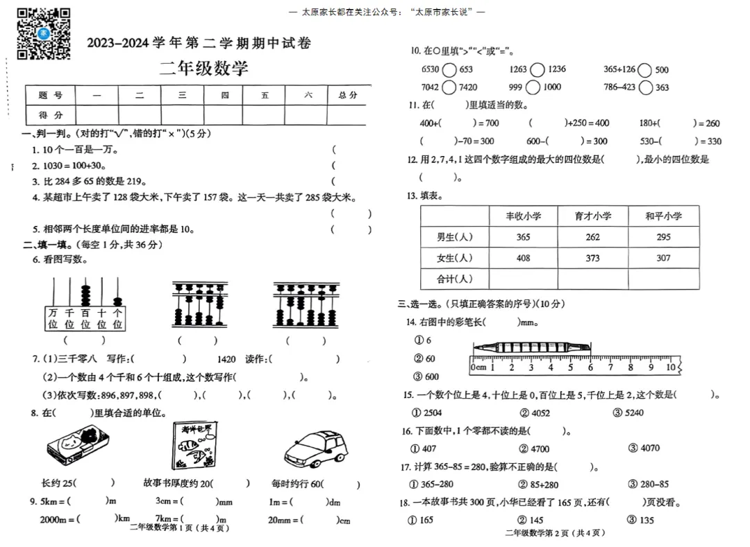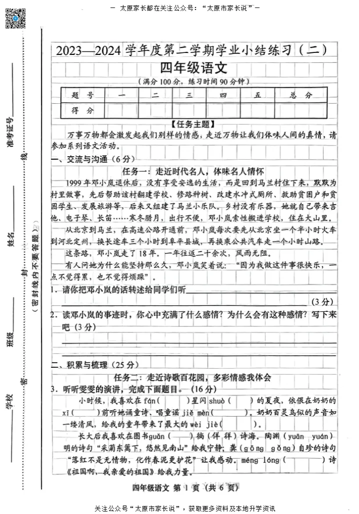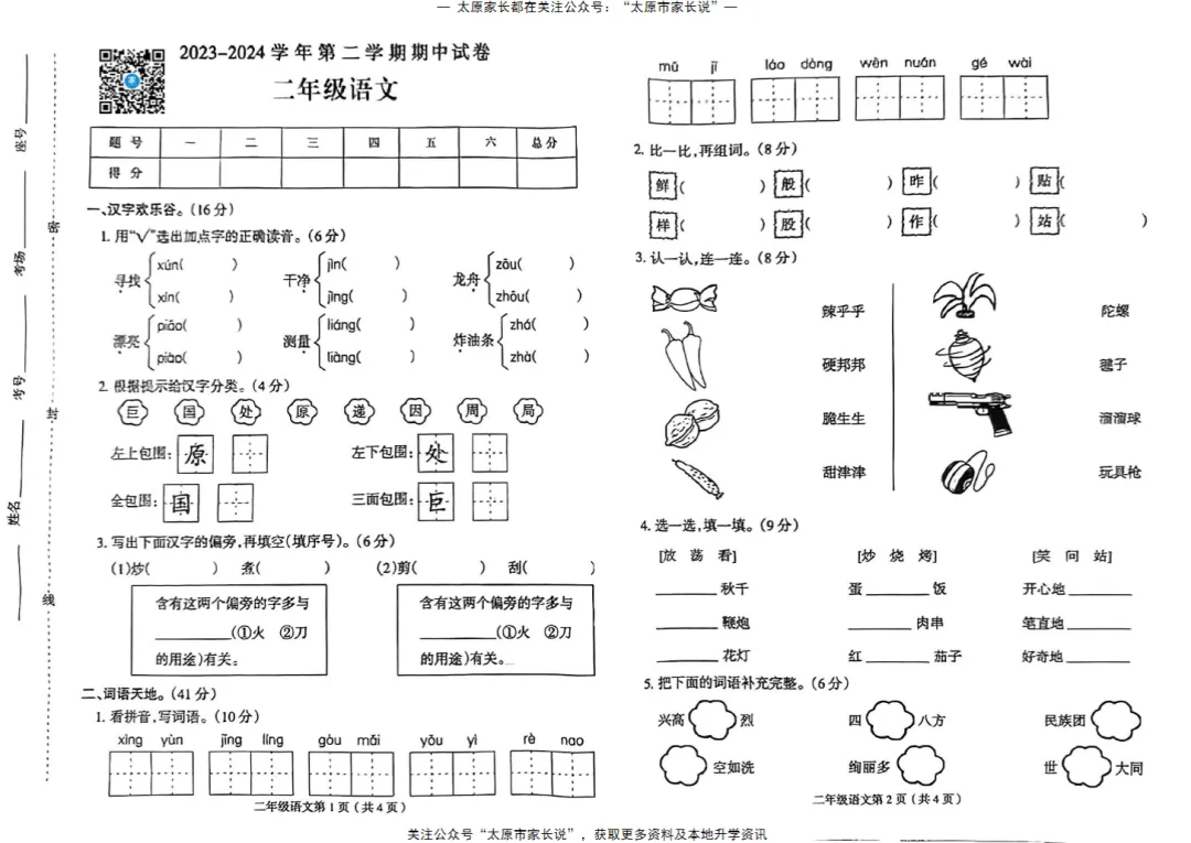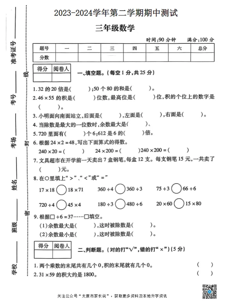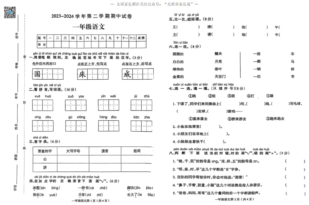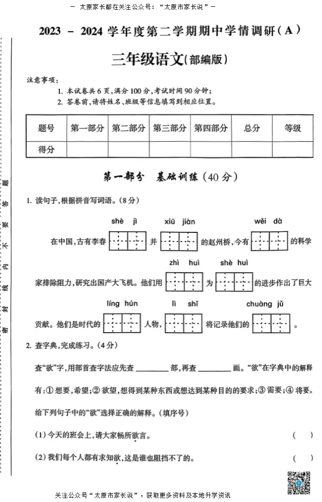 太原市小学往年下学期期中试题电子版免费领取!