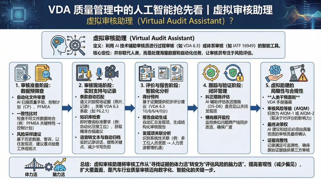 虚拟审核助理(Virtual Audit Assistant) 被定义为一种利用 AI 技术辅助审核员进行过程审核(如 VDA 6.3)或体系审核(如 IATF 16949)的智能工具。