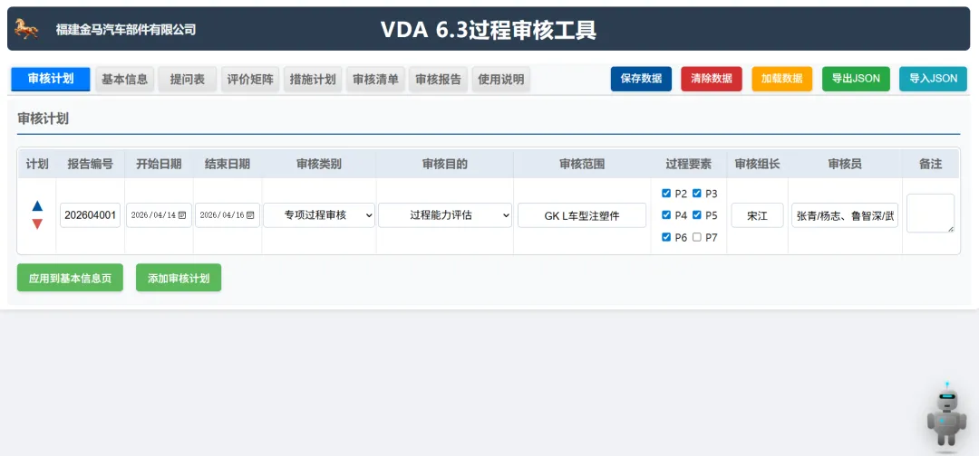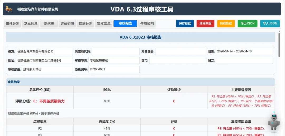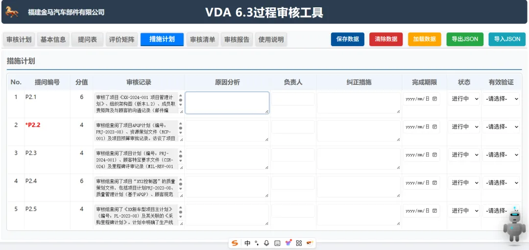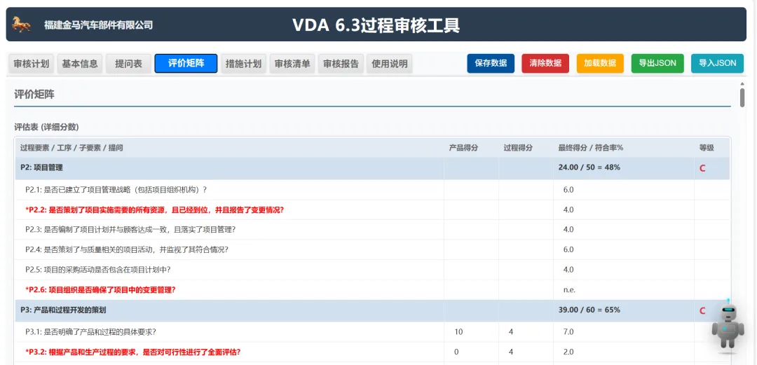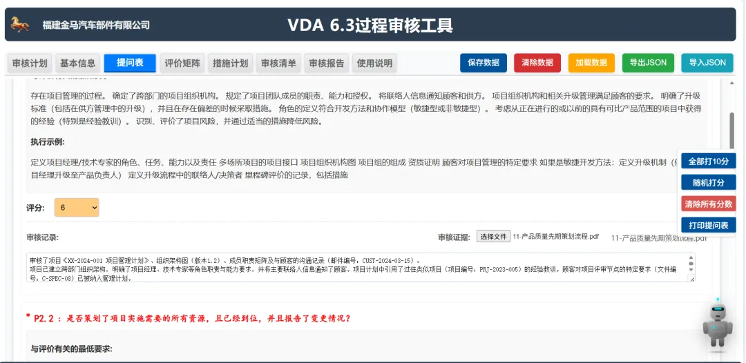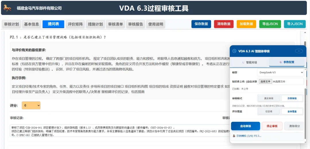 条款自动匹配:当审核员在现场观察到某个现象或收集到一份证据(照片、记录)时,AI 可以通过语义识别将其自动关联到 VDA 6.3 具体的提问表条款(如 P6.2.1 过程输入)。