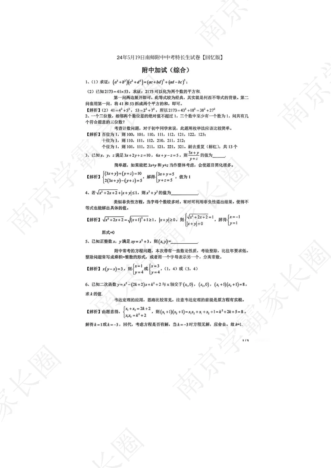整体而言,附中考试难度比往年下降了不少,整体没有特别困难的题型。不过题型大方向没有变化,仍然是代数题居多,一个小变化是,传统的必考题型因式分解今年没有出现。今年难度大致在中考到初中联赛简单题的范围;几何今年只有两题,一道圆中计算,一道梯形与相似结合,但都和计算关系紧密;方程题中涉及少量整除思想。