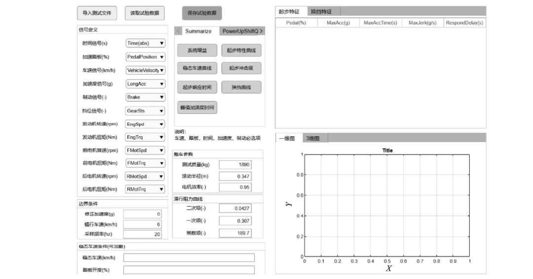 Fig.2 起步工况的软件设计界面(系统操作界面,含信号选择、参数配置、结果显示模块)
