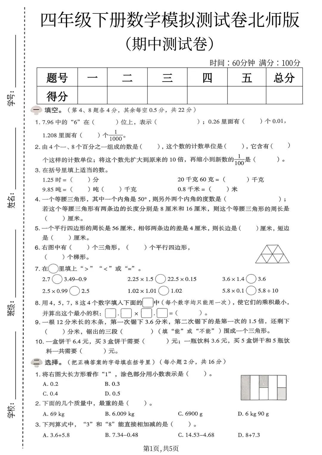 南星伴学营今日给大家分享26年春新版四年级下册数学北师大版期中模拟测试卷,完整版含答案,电子版可打印!有需要的家长可以保存打印啦!