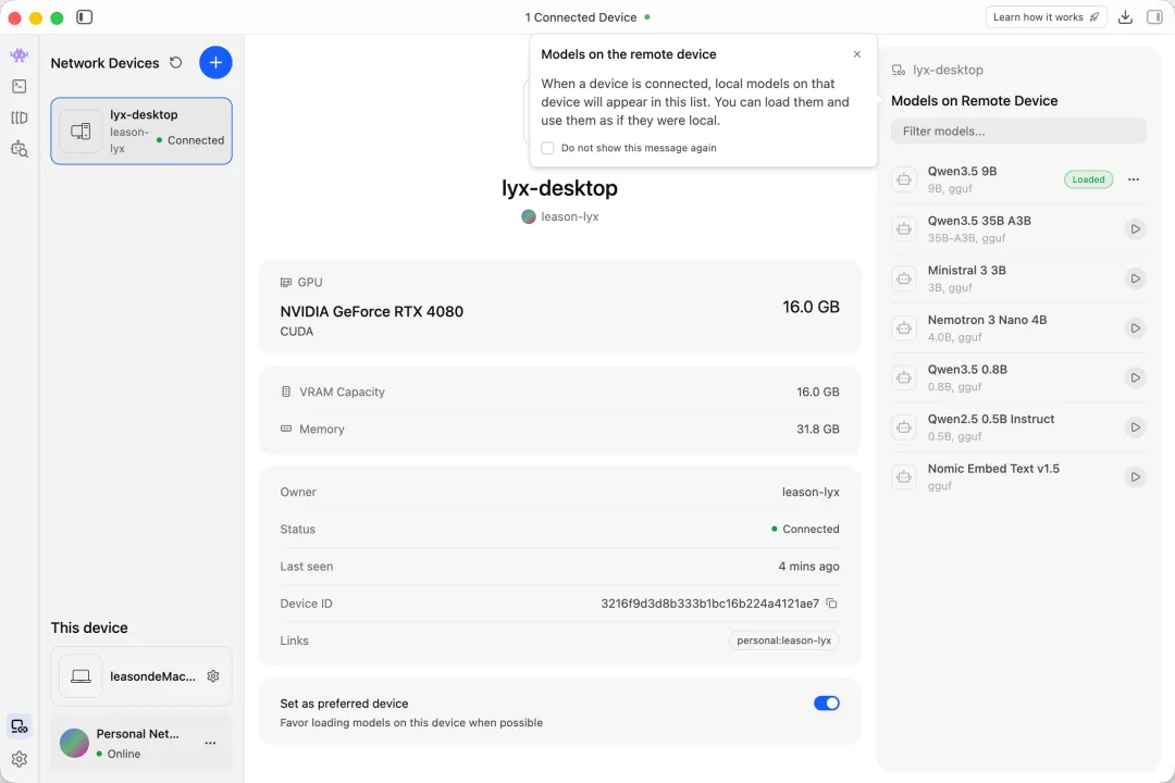 由于我的macbook只有16g内存,部署本地模型比较捉襟见肘。我就希望能把模型部署在台式机4080上,在macbook进行调用。幸运的是,最近LM Studio推出了LM Link服务,可以非常简便地实现这个效果。