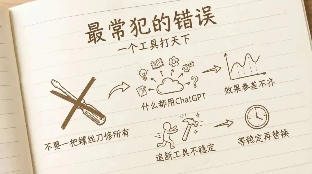 另一个常犯的错误是盲目追新。每隔几天就有新工具发布,但大部分新工具不稳定、生态不完善、学习成本高。我的原则是:新工具先观望,等稳定了再小规模试用,确认好用了再替换旧工具。