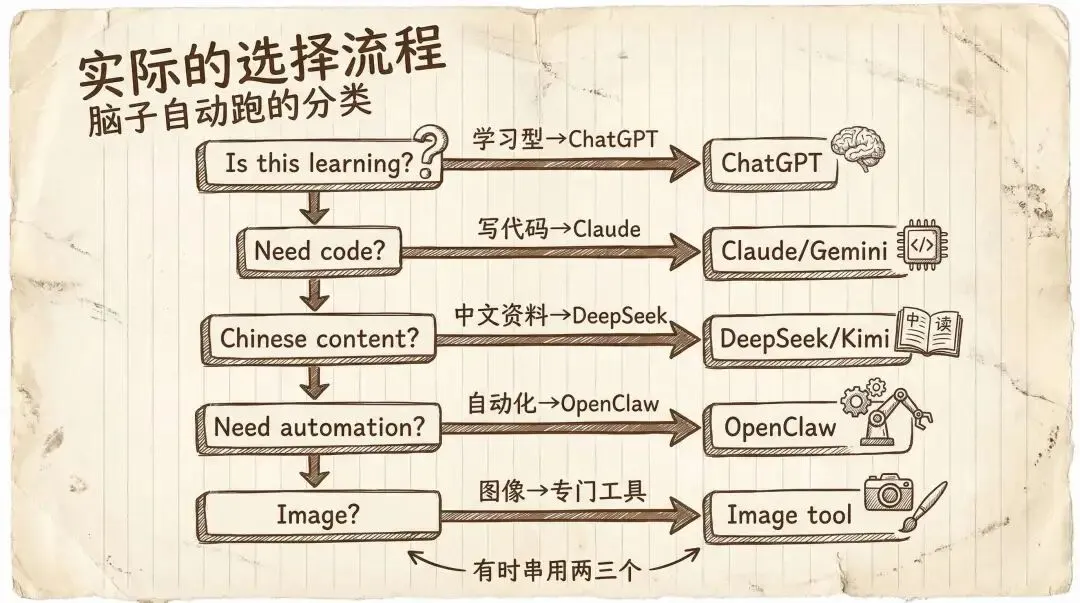 这个分类不是死板的,有时候一个任务会用到两三个工具。比如我写论文实验部分:先用 ChatGPT 理解某个方法的原理,再用 Claude Code 写实验代码,最后用 DeepSeek 搜一些中文参考文献。