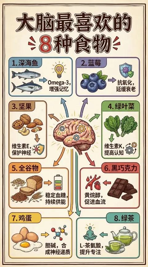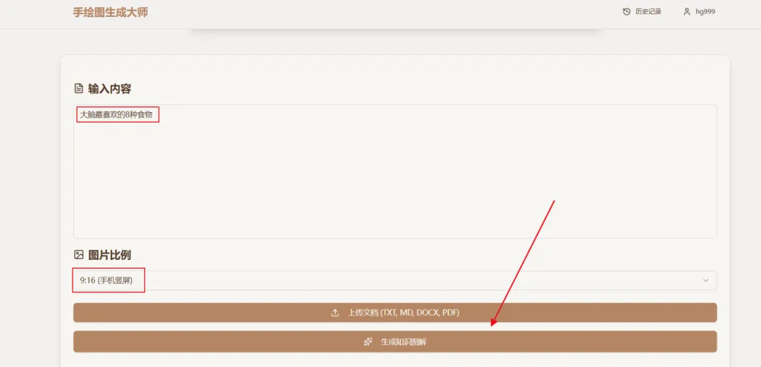 养生领域输入文案:大脑最喜欢的 8 种食物选好尺寸比例,一键生成知识卡片,大约 40 秒就能出图。