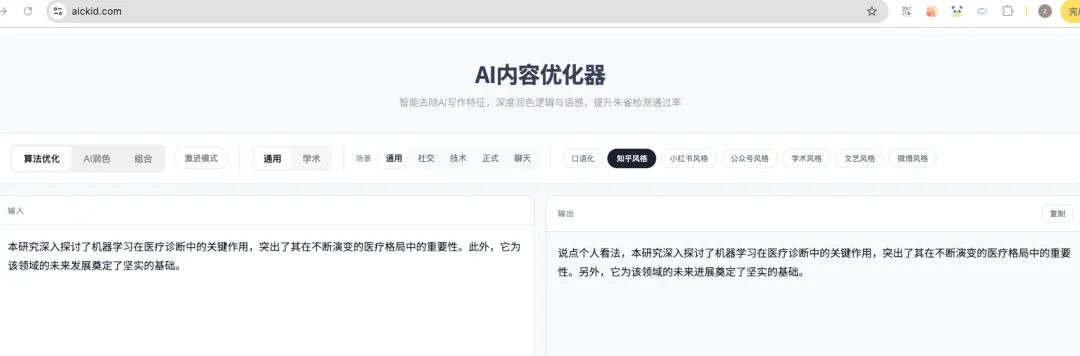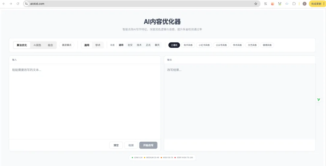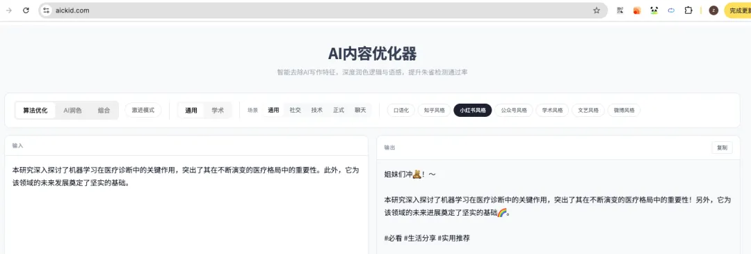 目前,支持算法优化和AI润色两种模式,有口语化、知乎、小红书、公众号等7中风格