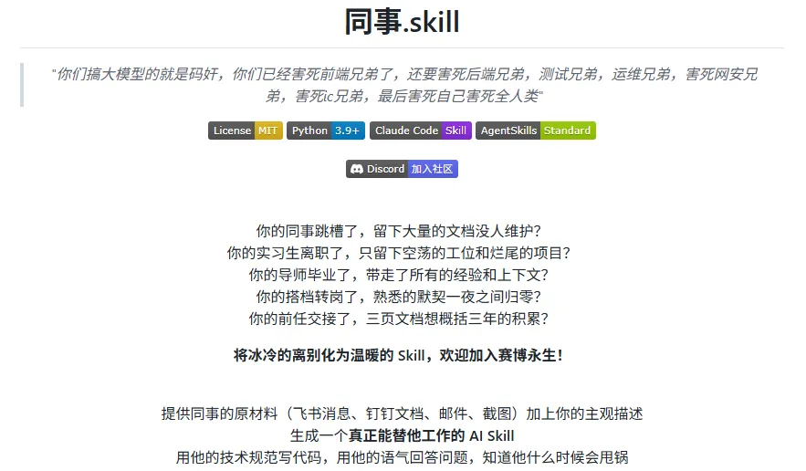 前几天刷GitHub,一个叫「同事.skill」的项目爆火,短短一周狂揽8000颗星,评论区全是打工人的哀嚎:“码奸!你们害死前端害后端,现在还要把我们炼成交差工具人!”