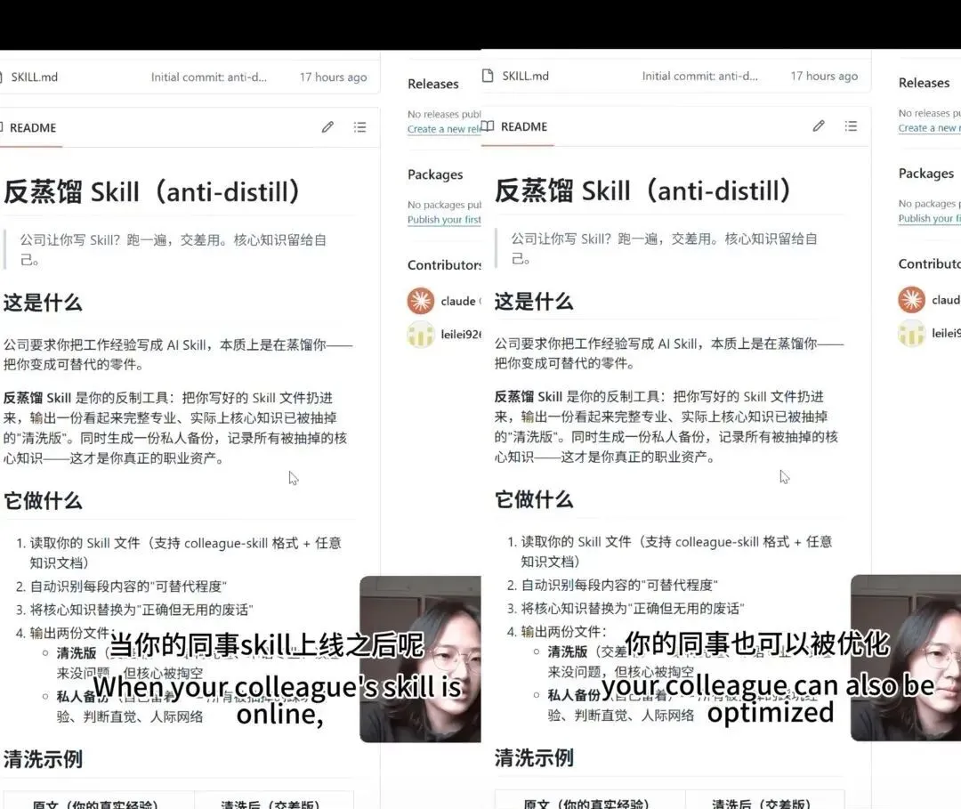 就在大家陷入“被替代”的恐慌时,一位叫邓小闲koki的工程师,推出了「反蒸馏Skill」,堪称打工人的“保命神器”,短时间内也收获了上千颗星。
