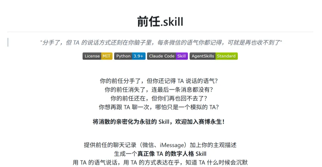 ✅ 前任.skill:上传聊天记录,就能生成一个会用TA语气说话的数字分身,哪怕分手了,也能再“聊”一次(多少有点自我感动,但架不住大家爱用);