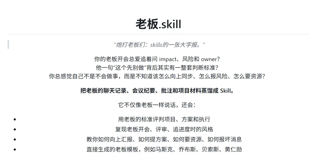 ✅ 老板.skill:把老板的会议纪要、聊天记录喂进去,它会教你怎么向上汇报、怎么提方案、怎么要资源,甚至能模仿老板的语气评判你的工作;