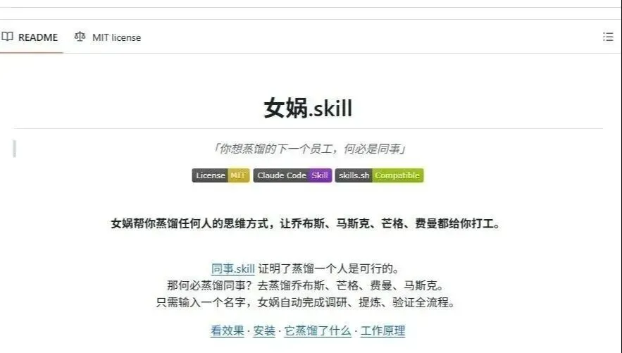 ✅ 女娲.skill:更离谱,输入名人名字,就能蒸馏马斯克、芒格、费曼的思维方式,主打一个“让大佬给你打工”;