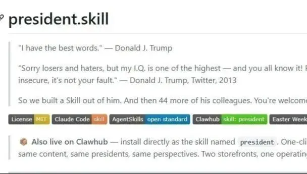 ✅ 总统.skill:外国工程师跟风开发,把特朗普和44位美国总统“炼”成Skill,连特朗普的“我有最好的话术”都能完美复刻。
