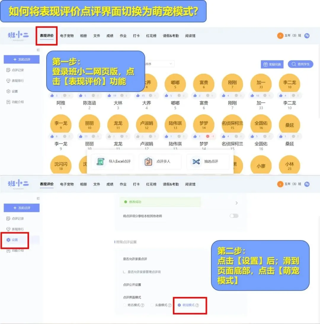 在网页版点击【表现评价】功能,点击【设置】,下滑到页面底部的【点评界面模式】,选择【萌宠模式】