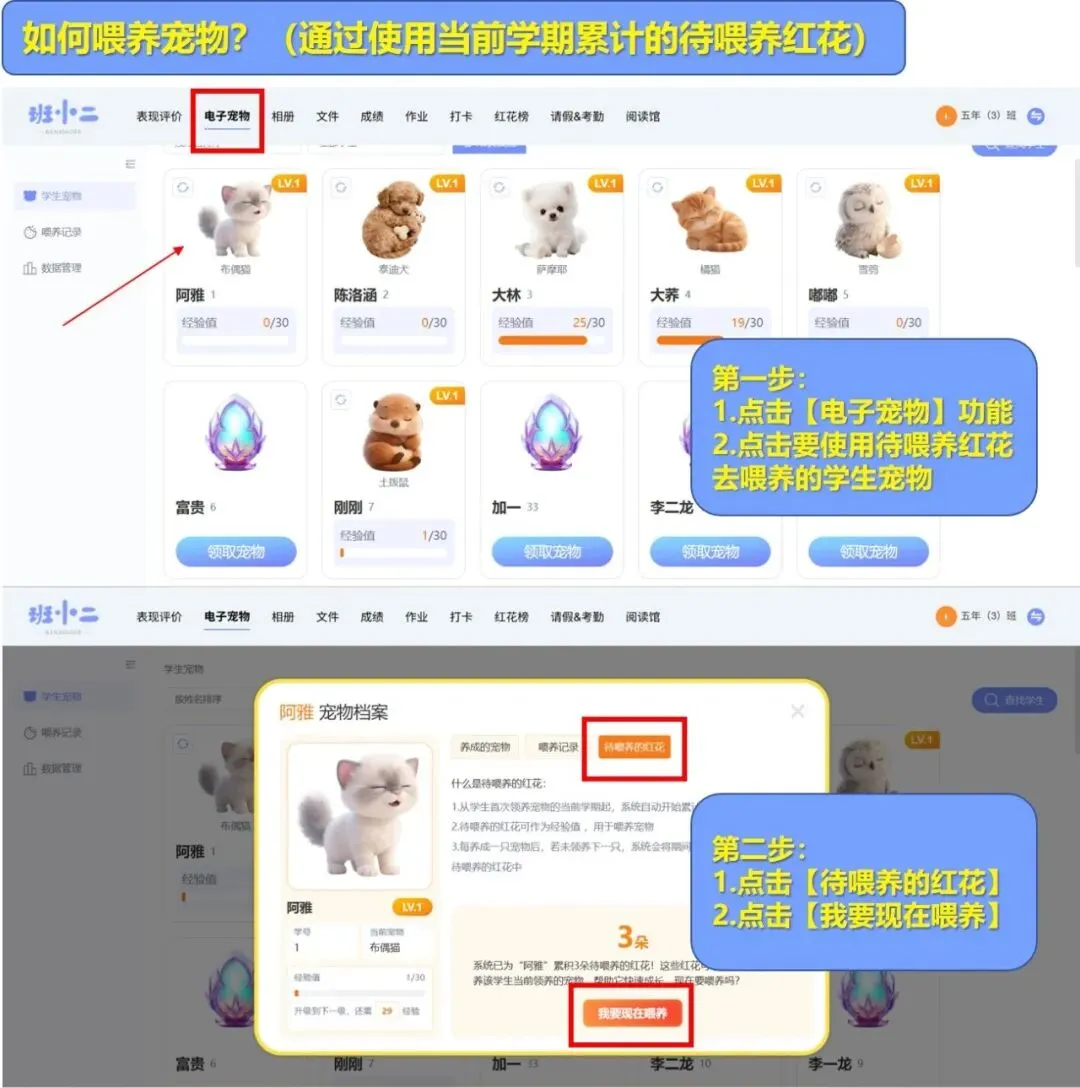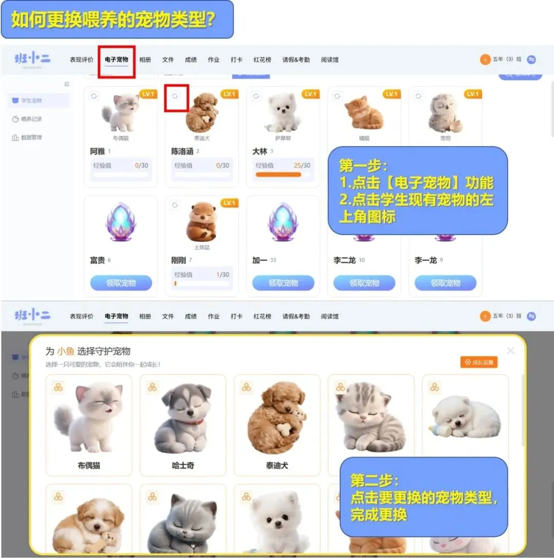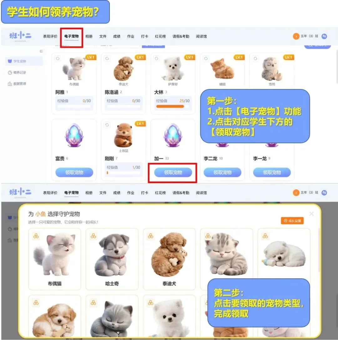 点击【电子宠物】/【表现评价】功能,点击在学生名字下方的【领取宠物】,即可选择要守护的宠物