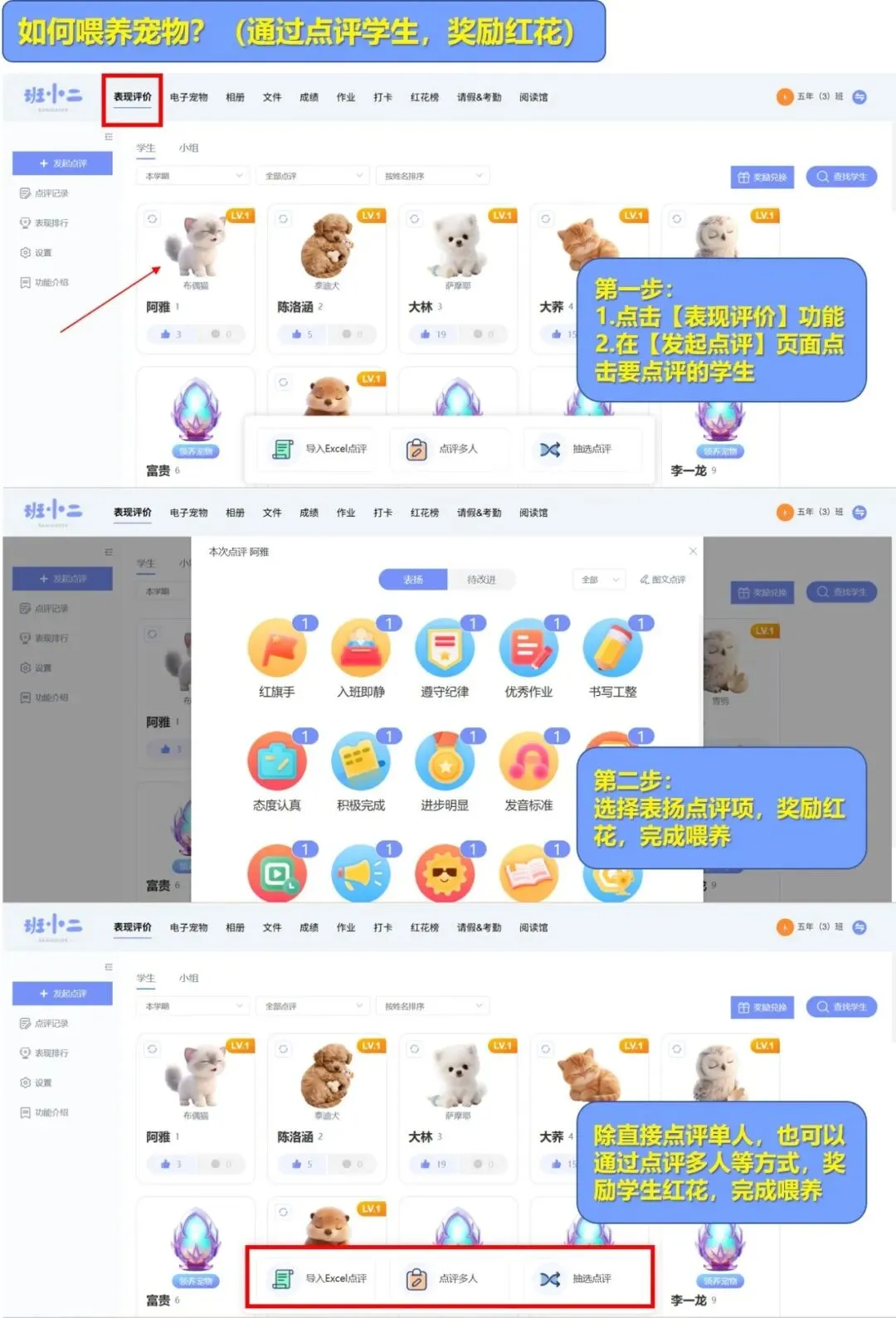 在【表现评价】功能内,可以直接选择学生进行点评,或选择其他点评方式进行点评,如导入Excel,点评多人等