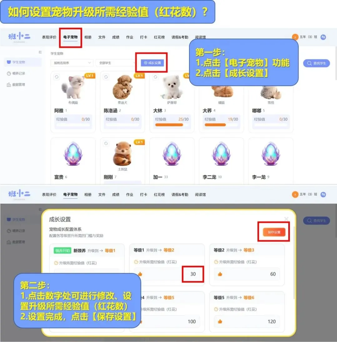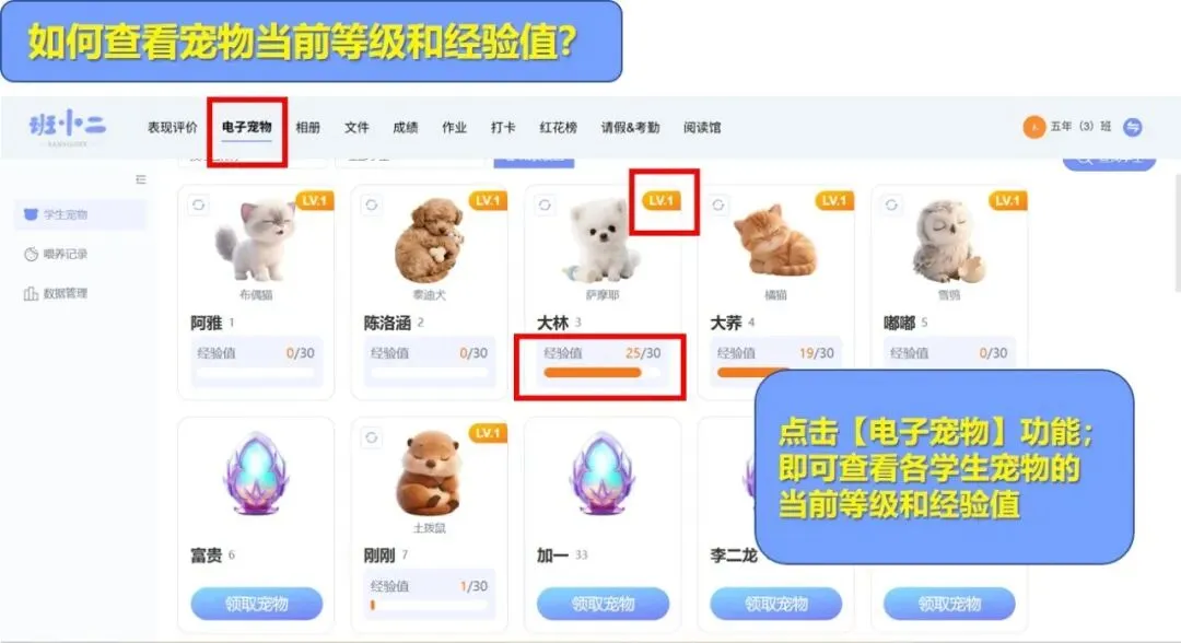 点击【电子宠物】功能,即可查看各学生宠物的当前等级和经验值