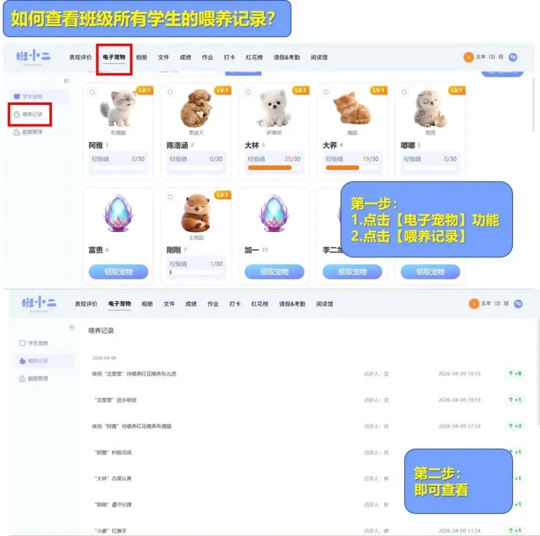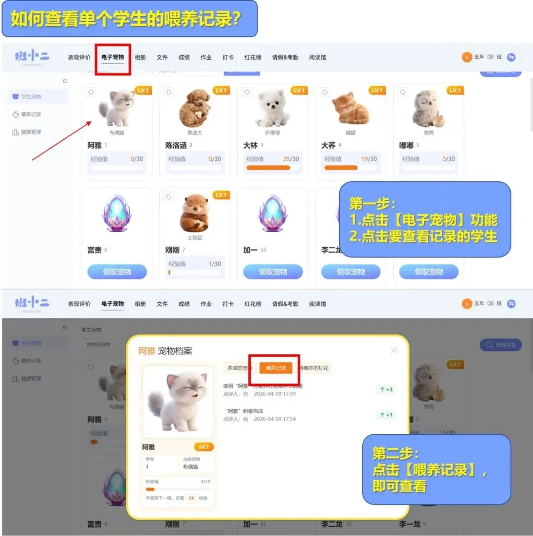 第1步:点击【电子宠物】功能,点击要查看记录的学生;