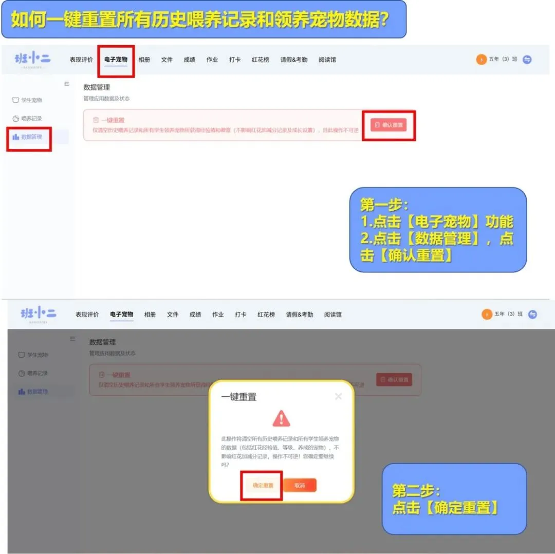 第1步:点击【电子宠物】功能,点击【数据管理】,点击【确认重置】;