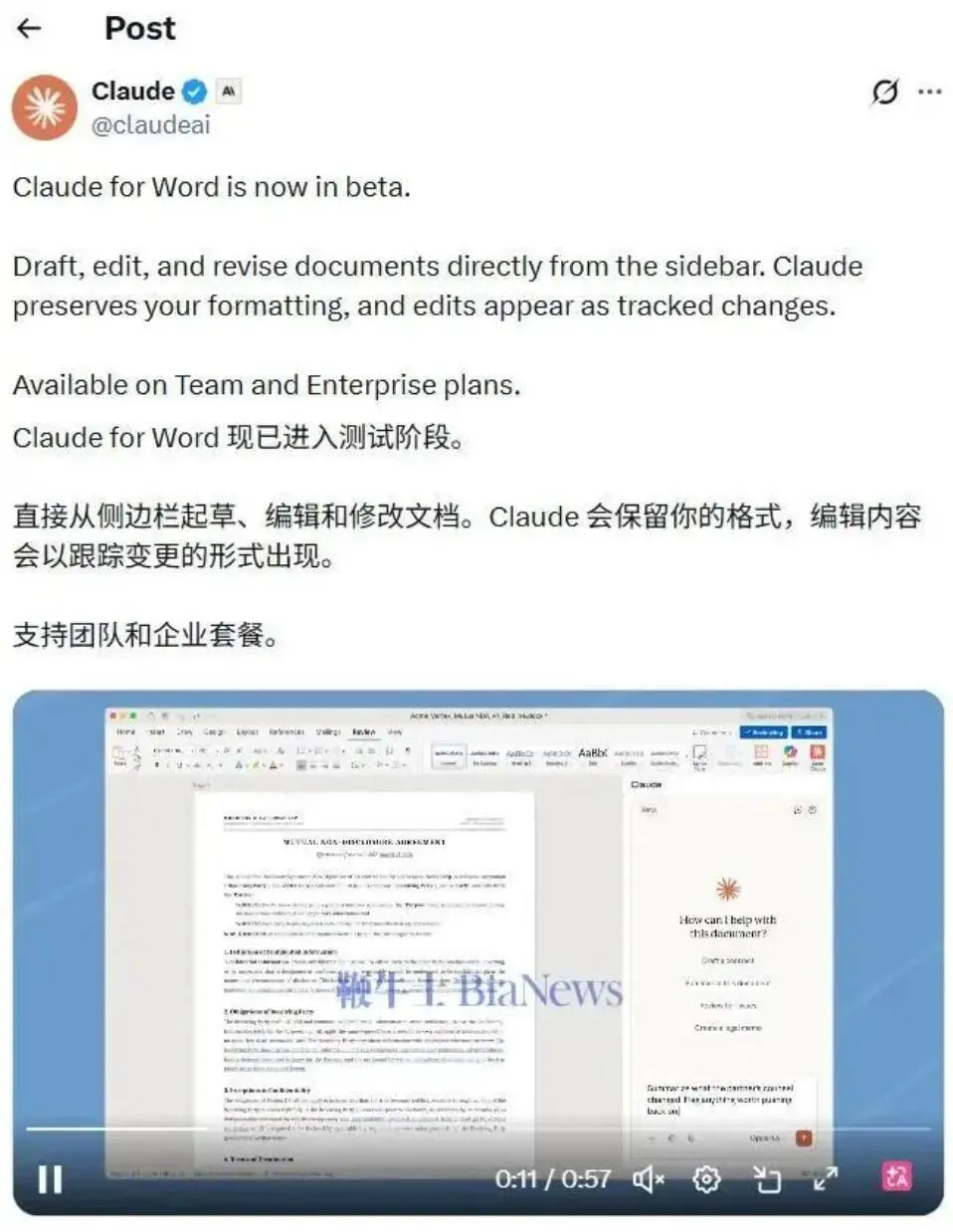 AI 与办公软件的深度融合又迎来里程碑!近日,Anthropic 正式推出Claude for Word测试版功能,将 Claude AI 助手深度嵌入 Microsoft Word,彻底打破文档编辑与 AI 交互的壁垒,让专业人士无需切换窗口,就能在文档内一站式完成智能写作、合同审查、团队协作等全流程工作。