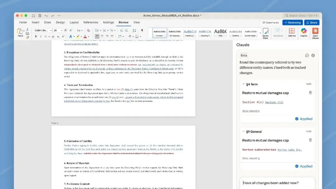 Claude for Word 走的是另一条路——不是把 AI 对话框塞进 Word,而是让 AI 成为 Word 的一部分。