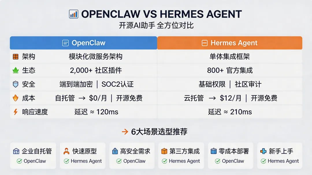 预算有限想零成本,两个都支持本地模型,但 Hermes Agent 对本地模型的优化更好。企业使用需要安全可控,Hermes Agent 默认权限设置更保守。